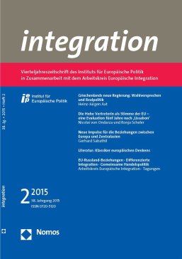 In dieser Ausgabe der integration untersucht Heinz-Jürgen Axt die Programme und Wahlversprechen der griechischen Regierungsparteien und stellt deren Positionen und Verhaltensmuster in den aktuellen EU-Krisengesprächen dar. Nicolai von Ondarza und Ronja Scheler bilanzieren die Außendarstellung der ersten Hohen Vertreterin der Union für Außen- und Sicherheitspolitik und bewerten die ersten 100 Tage des Wirkens ihrer Nachfolgerin als Stimme der EU. Gerhard Sabathil widmet sich den Beziehungen zwischen Europa und Zentralasien. Er erkennt dabei Fortschritte bei der Umsetzung der Zentralasienstrategie in den vergangenen sieben Jahren an, zeigt aber auch Möglichkeiten zur Verbesserung auf. Christoph Vedders Sammelrezension bespricht Werke zum langen Weg der Einigung Europas. Eines der Werke greift Gerhard Sabathil in seiner Rezension erneut auf. Für den Arbeitskreis Europäische Integration wird von dessen Jahreskolloquium 2014 zum Thema EU-Russland-Beziehungen, von einer Tagung über die Formen differenzierter Integration und von einer Konferenz zu den aktuellen Entwicklungen in der Gemeinsamen Handelspolitik der Europäischen Union berichtet.